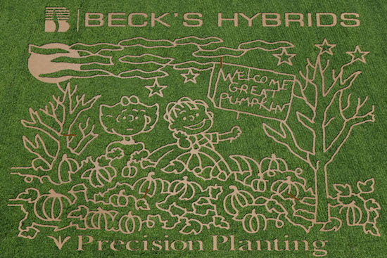 We plant Beck’s Hybrids seed corn in early June using GPS technology of our partner, Precision Planting, that allows seeds to be planted within half an inch of the exact spot where we want them. The planter crosses the field a second time so the maze is more dense than a typical corn field. After planting, we add two bridges that allow you to climb and adjust your internal GPS or just enjoy a spectacular view of the maze and grounds.